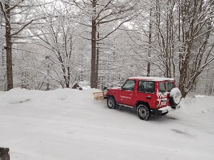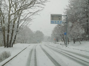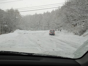 本日未明より降り始めた雪は10cm程積もりました。昨日現在、県道は乾いて走行しやすかったのですが、新雪が積もってしまいました。今日の雪質は大変滑りやすくなっております。お気をつけ下さい。天気予報ですと、明日昼まで降り続く予報です。3月も終わりだというのに・・・大雪になるのかな?