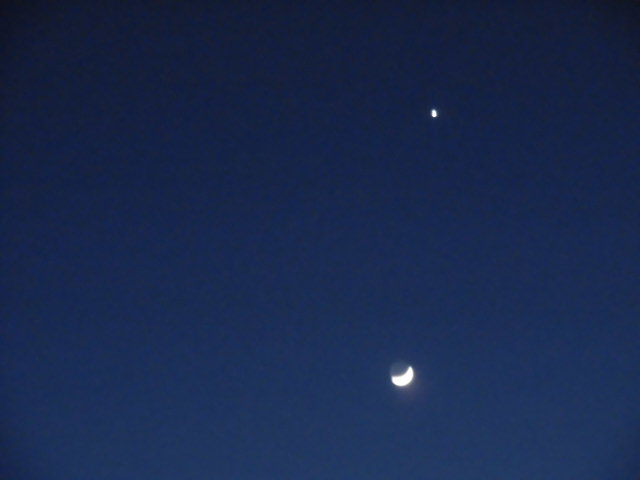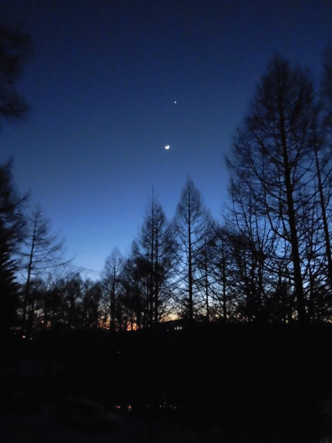 今、S・Aが「月と金星、その上に火星も見える!!」と喚声を上げて事務所に入ってきました。すばやくK・Sがデジカメで撮影!!!!西の空に「宵の明星」それはそれは素晴らしい光景が見えました。このカメラでは火星が写らないのが残念ですが、肉眼で火星も確認できました。 この澄んだ空気の中で見える事に感動しました。3月中旬頃まで見えるそうです。