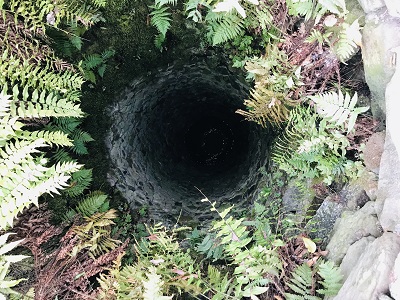 そして、眞田神社の社殿を左に進むと深い井戸があります。この井戸には抜け穴があるといわれていますが、どこだろう… 上から見下ろすと水面までよく見ることができます。