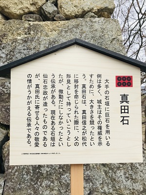 大手門には右側に鎮座する巨石「真田石」と呼ばれる大きな石があり、改めてその大きさに驚きました。実はこの石は横から見ると意外と薄く見えるのです。ただ、微動だにしなかったとの伝承があります。どうなんでしょうか…本当のところは分かりません。もし仮にそれが事実だったとするならば、現在積まれている大手門の石垣の真田石だけは昌幸が築城した当時のままここに置かれているということになるでしょう。なんともロマンあふれる伝承です。
