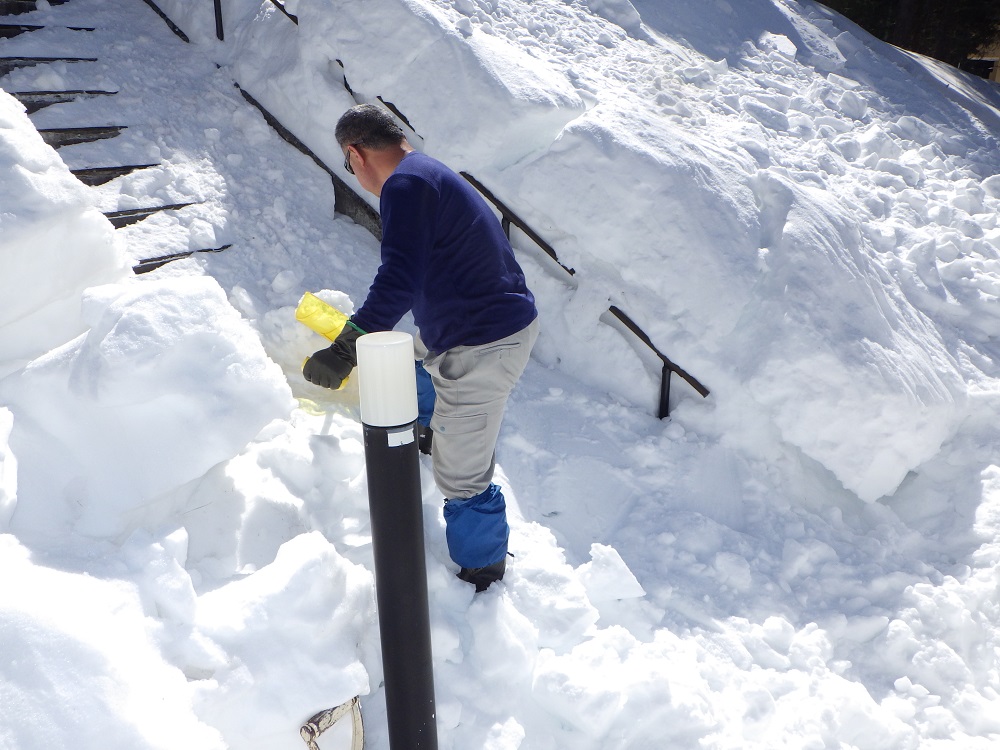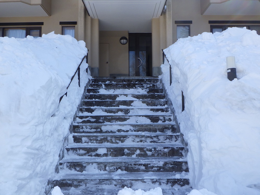 重い雪で階段を手で除雪するのは重労働!着ていた上着も脱ぎ、作業すること1時間!きれいに除雪完了!皆さん大変お疲れ様でした。
