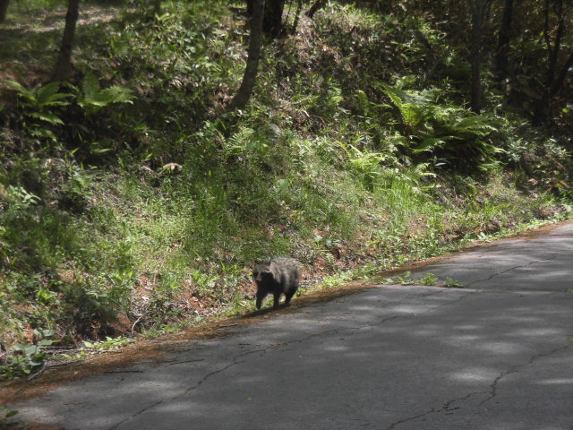別荘内巡回中の(H・I)が、かわいいタヌキに遭遇!!車中からパチリ 良いアングルで撮影できました。
