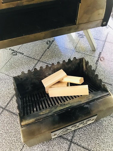 ↓ 引き出しを取り出し、そこに細かい薪と着火剤を入れて燃やします。火が点いたところで戻します。