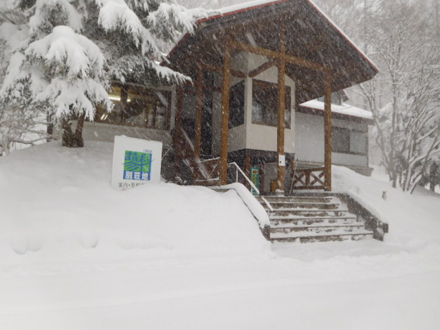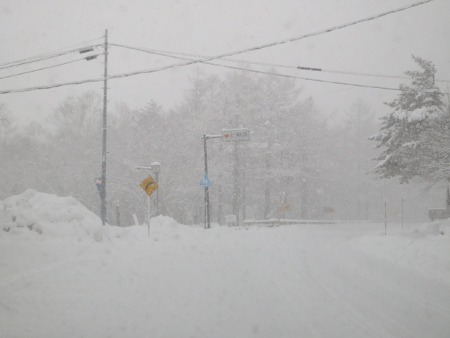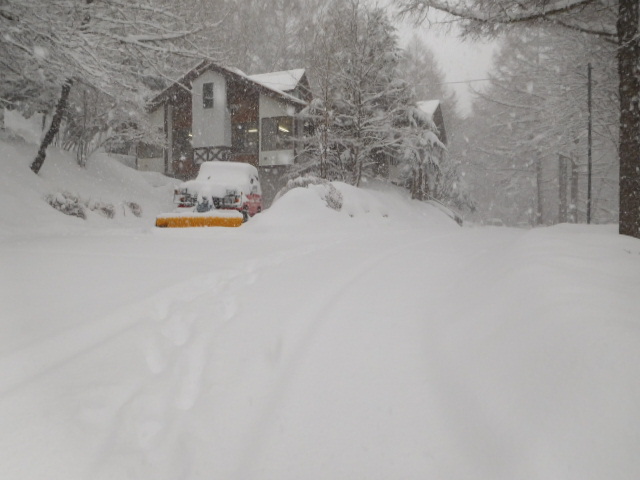 昨夜から降り出した雪は30cm以上積もりました。今シーズン一番の大雪です。現在も降っています。別荘地内町道は未明から除雪車が入っていたようですが、既に10cm程積もっています。
