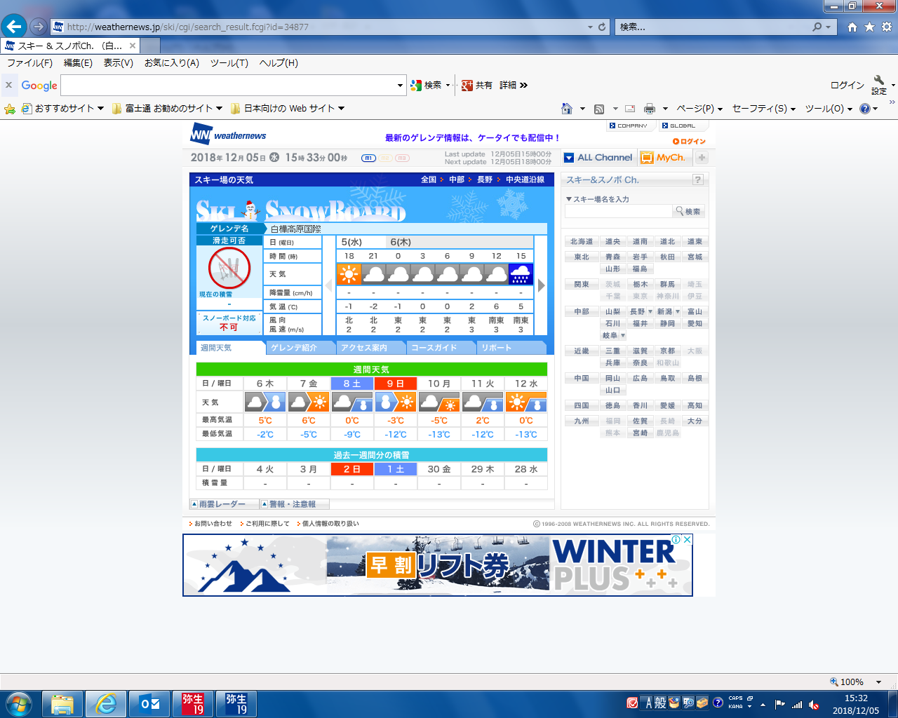 12月8日(土)オープン予定だった白樺国際スキー場・2イン1スキー場は積雪不足により12月15日(土)に延期になりました。 やっぱり!!って感じです。昨日も全国的に気温が高く、こちらも最高気温が12℃で、スノーマシンで作った雪も融けてしまいました。しかし、この後、急激な冷え込みがやってくる予報が出ており、9日(日)、10日(月)は氷点下12℃、13℃となっております。雪だるまマークも見えてきたので、15日(土)はオープン大丈夫かな?