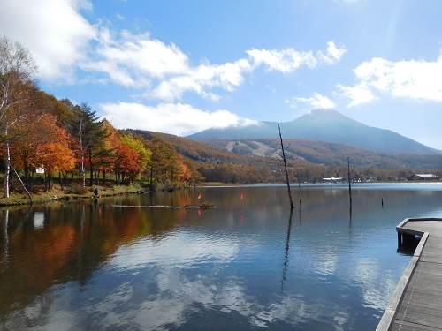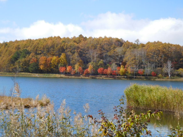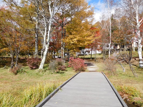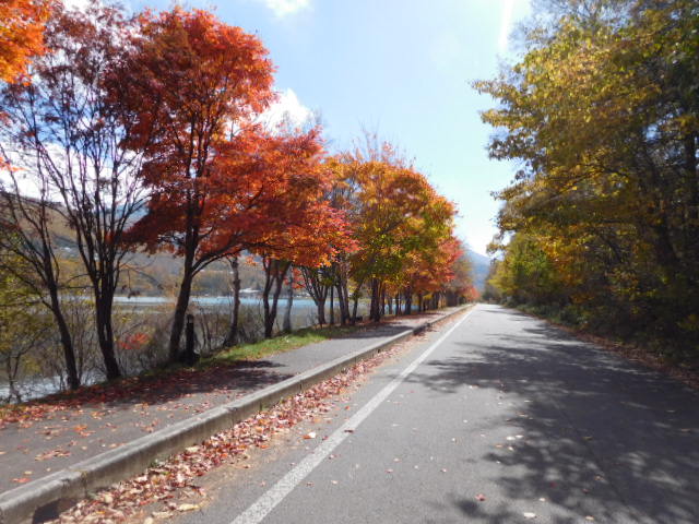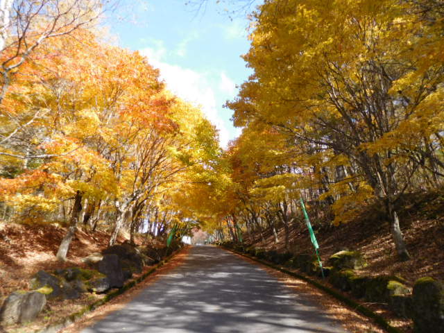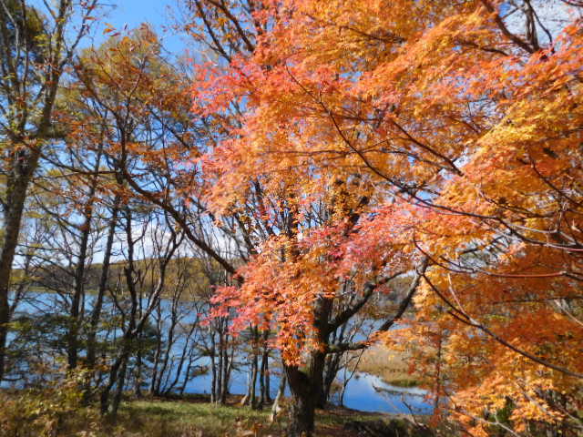 事務所前のモミジの紅葉が見頃です。女神湖周りも鮮やかな色に染まり、カメラ片手に散歩している方がいらっしゃいました。