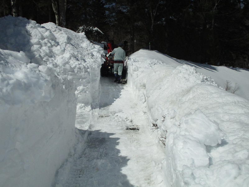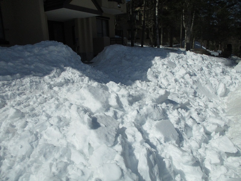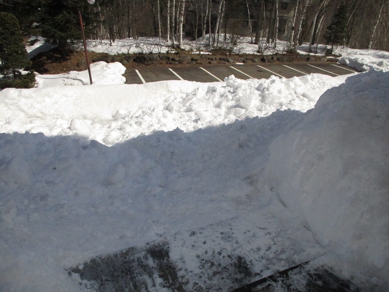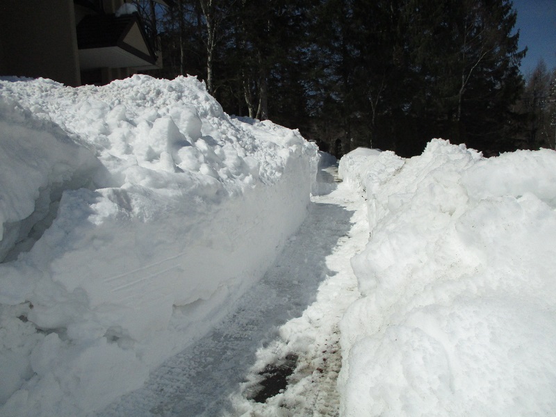 昨日までの冷え込みがうそのよう!今日は一気に気温が上昇しています。そんな中、ロイアルヴィラ蓼科の屋根から落雪!!。通路が潰れてしまったため大型スノーロータリーで除雪作業しました。機械では入れない階段部分などは手作業です。スタッフは着ていた服を1枚…2枚…と脱ぎながら、最後はシャツ1枚で黙々と作業!!本当にお疲れ様です。 見てください!除雪後のきれいな様子を・・・立山黒部アルペンルートをミニサイズにしたような風景です。(ご参考までに、立山黒部アルペンルートの開通は4月15日(土)、ビーナスラインの開通は4月21日(金)です。)