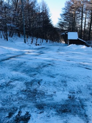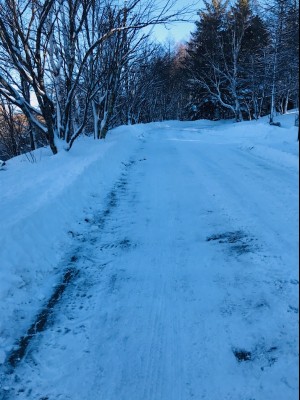 ↓ 今朝の事務所前の様子です。除雪されて路面が少し見えています。