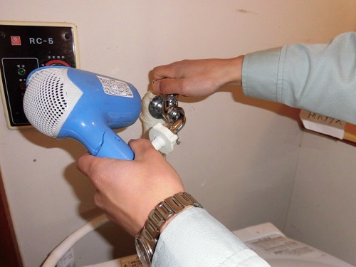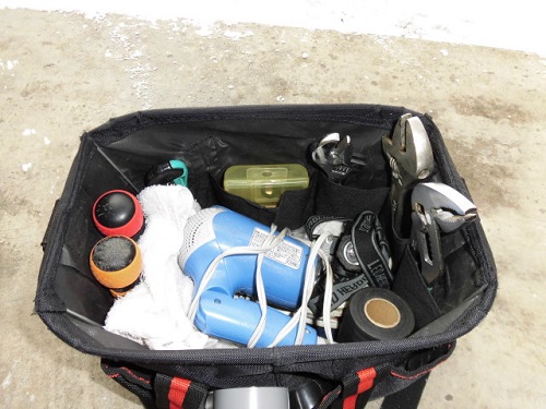 弊社スタッフは現場に出る際、この道具入れを持ち出動します。この中には水出し・水抜き作業で必要となる、言ってみれば「七つ道具」が揃っています。しかし、この中に道具とは思えない「ドライヤー」がありますが…このドライヤーは???