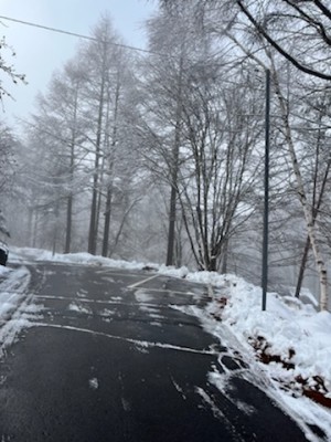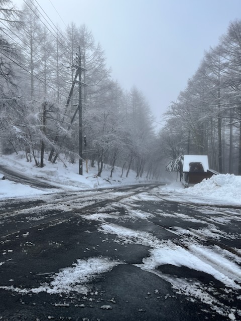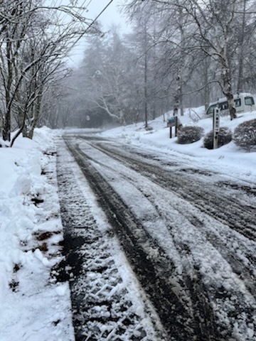 今現在は、時折晴れ間も出ており気温も高いので、路面の雪はずいぶん無くなってきています。木の上にあった白い雪はほとんど溶け、残るは路肩や草地の上にある雪でしょうか。