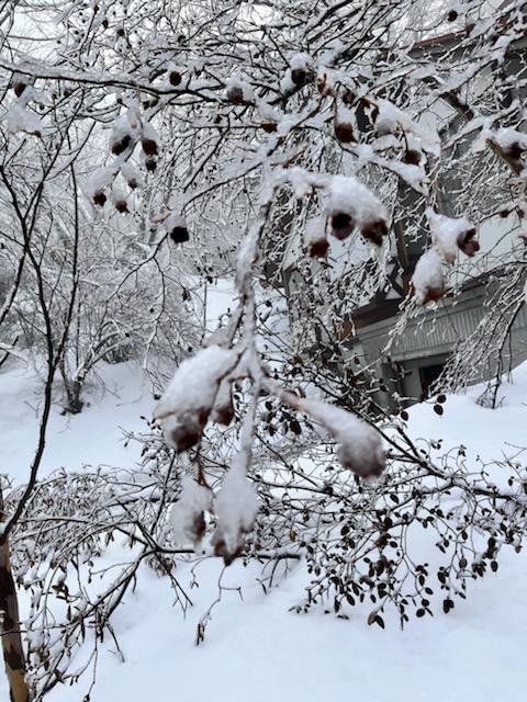 昨日は朝から小雨でしたが、15時頃からみぞれに変わり、日が暮れるころには重そうな大粒のぼたぼたしたぼたん雪へと変わっていきました。夜の間にも降り、今朝には10㎝程の積雪になりました。水っぽく滑りやすい雪で、春らしい雪ともいえます。