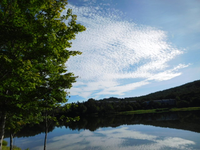 雲の動きがいつもとちょっと違うような…?女神湖に映る雲、どっちがどっちか錯覚に陥る。逆さまに写真は撮れませんでしたが…(笑)