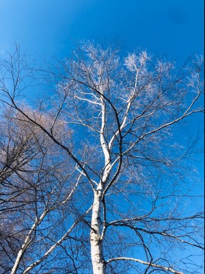 周りを見渡すと、白樺の木の白さに霧氷による枝先の白さがプラスされて、青空に映えます。