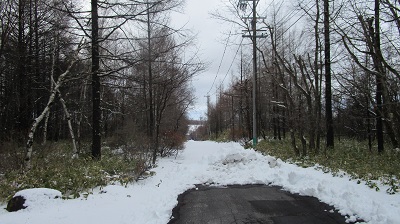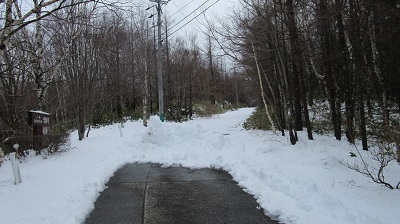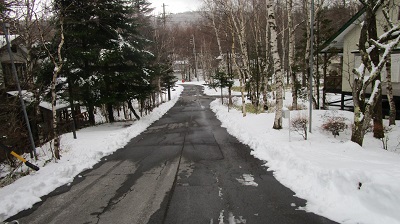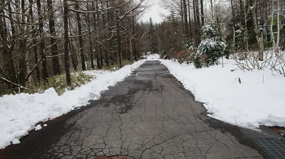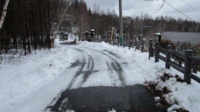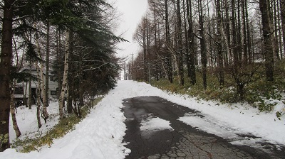 気温は変わらずにプラスです。周りの木々に付いていた氷もだいぶ解けてきました。路面の雪も解けてきましたが、別荘地内の道路の様子を撮ってきましたので、ご覧ください。