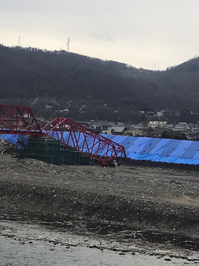 昨年10月の台風19号で「別所線」の鉄橋の一部が崩落して以降、24時間体制で堤防を直しています。久しぶりに近くを通ってみると、削られて陥没していた堤防は形が出来上がっており、橋の撤去作業が行われようとしていました。