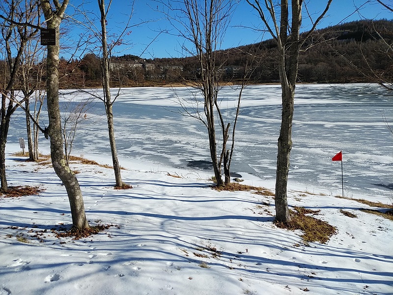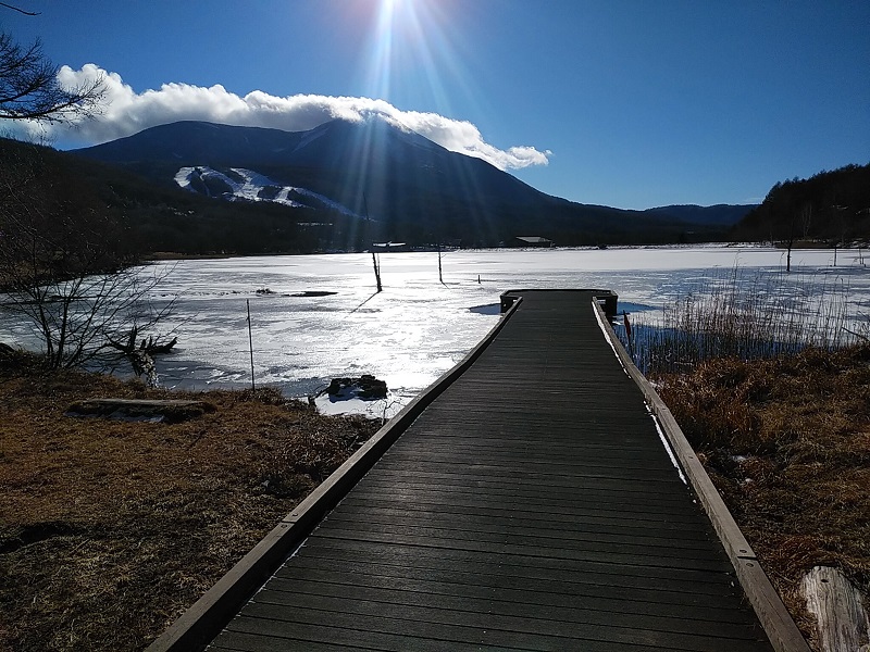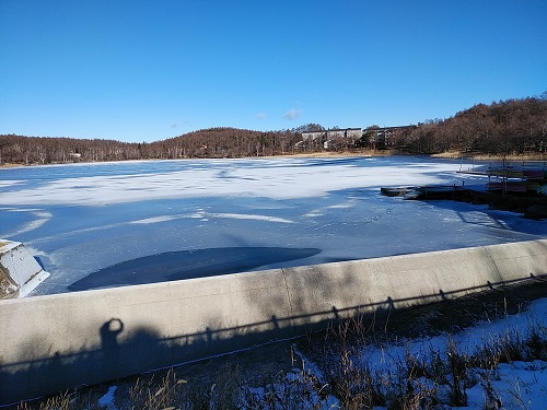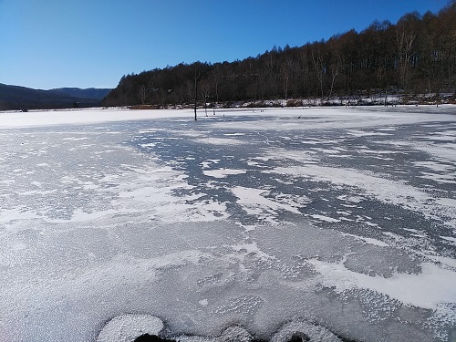 スキー場はオープンしたものの、積雪量が少ない状況の中、気温は低く女神湖が全面結氷しました。写真は、A部長が今朝、先々月換えたばかりで慣れないスマホで撮影してきてくれました。素晴らしい画像だと思いませんか?(A部長は、自分の影が映っているのは気づいておりませんので悪しからず・・・)