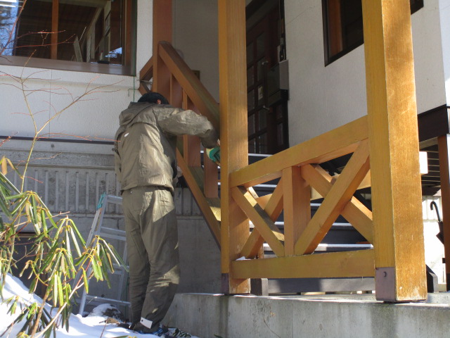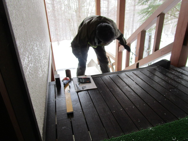 弊社工事担当:塩澤がまた作業を始めました。ふと様子を見に行ってみると、玄関の扉の横に取っ手?!!ドアが新しくなるのか?と思いきや…、実はこれ「手摺り」なのです。