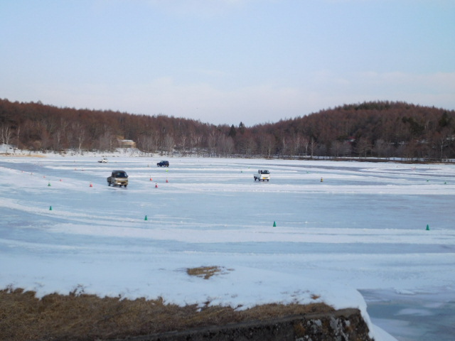 女神湖では氷上ドライビングが始まっています。まるでフィギュアスケーターの回転のように車がくるくる回っていました。(怖いよ怖いよ怖いよー)