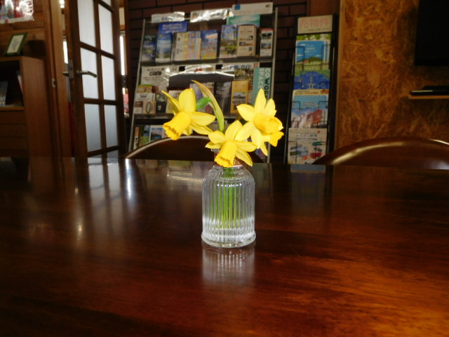 この暖かさで我が家のミニスイセンが咲き始めました。早速事務所に飾りました。