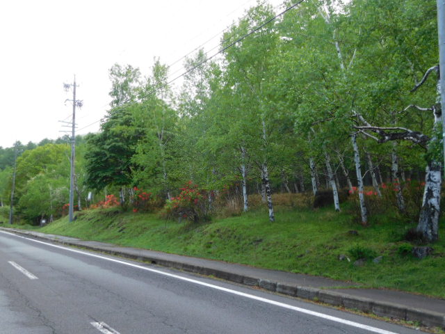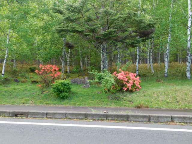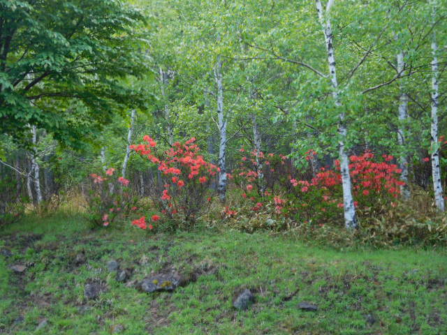 昨夜降った雨があがり、今朝は晴れて気持ちイイ朝になりました。青々とした白樺の木の下で咲き始めた、色鮮やかなレンゲツツジが雨上がりの朝に相応しい景色です!!