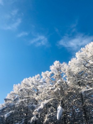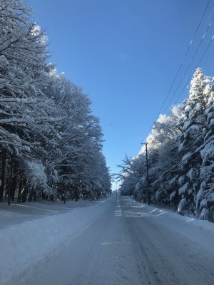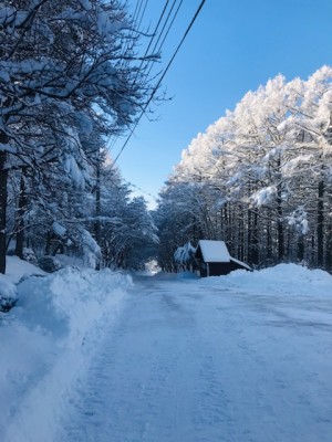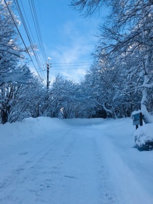一昨日からの雪が降り続き、積雪が今季一番の積雪量となりました。昨日の時点で20~30㎝、夜の間に5~10㎝積もり、今朝は昨日よりも多い雪に驚きました。お天気は朝から快晴で、青空と雪が付いた木々の色のコントラストがきれいです。