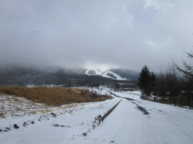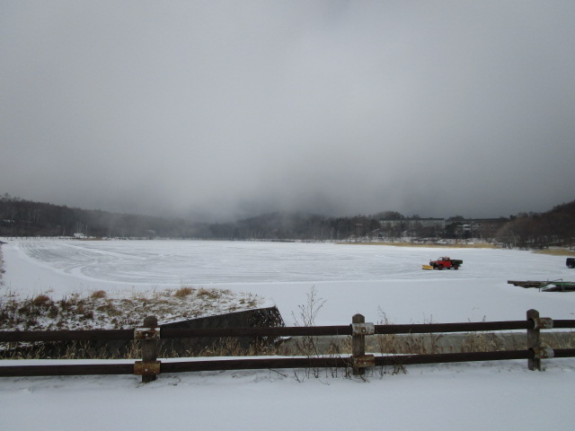 今日は蓼科山がスッポリ隠れています。例年ですと、路面は見えないくらい圧雪状態なのに、今年は路面が見えています。 女神湖の氷がなかなか厚くならないようで、例年行われている氷上ドライビングスクール、開催できるのかなあ?と思っていたら、先週から氷に穴を開けて、湖水をポンプアップして氷上に撒いていました。本日除雪車が1台、氷上を除雪していました。車両が乗れるだけの厚さになったということでしょう。外気温が低いので氷上に水を撒いた方がいち早く凍るということなのかな?・・・