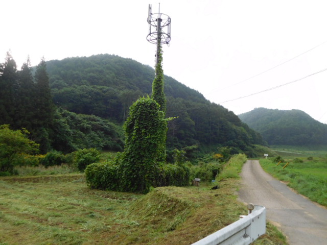 通勤途中に面白い電波塔が目に入ったので撮影してきました。電波塔に絡みついた雑草が「隣のトトロ」のアニメの中に出てくる木のようになっているのです!このままだと塔のてっぺんまで伸びていく勢いですが、昨日あたり周辺の草刈り作業をした様子だったので、おそらく数日中には枯れてくるかと思いますが・・・枯れて電波塔の全容が見えてきましたら再度アップしますね。