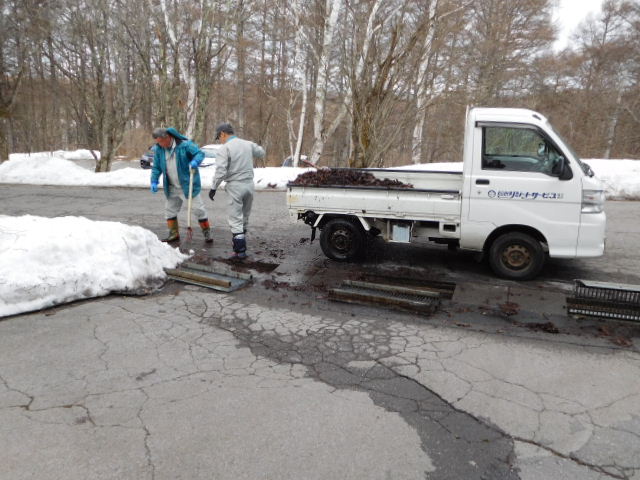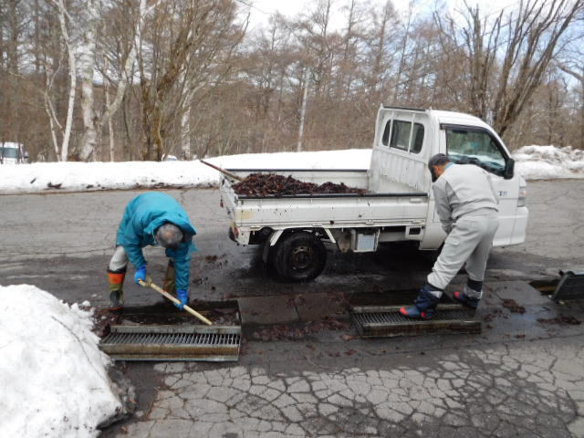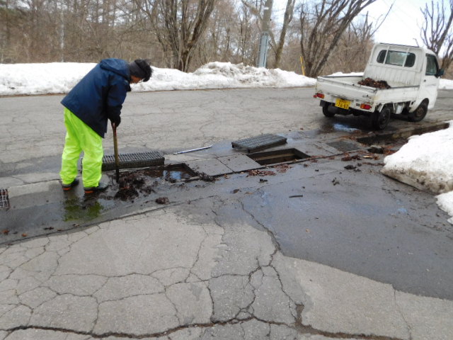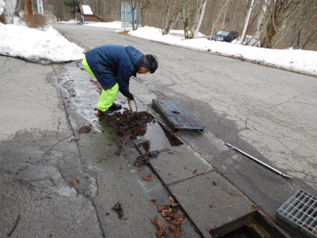 側溝に詰まった枯葉処理。まだ雪が残っているので、できるところから始めています!これからGWまで環境整備が続きます。